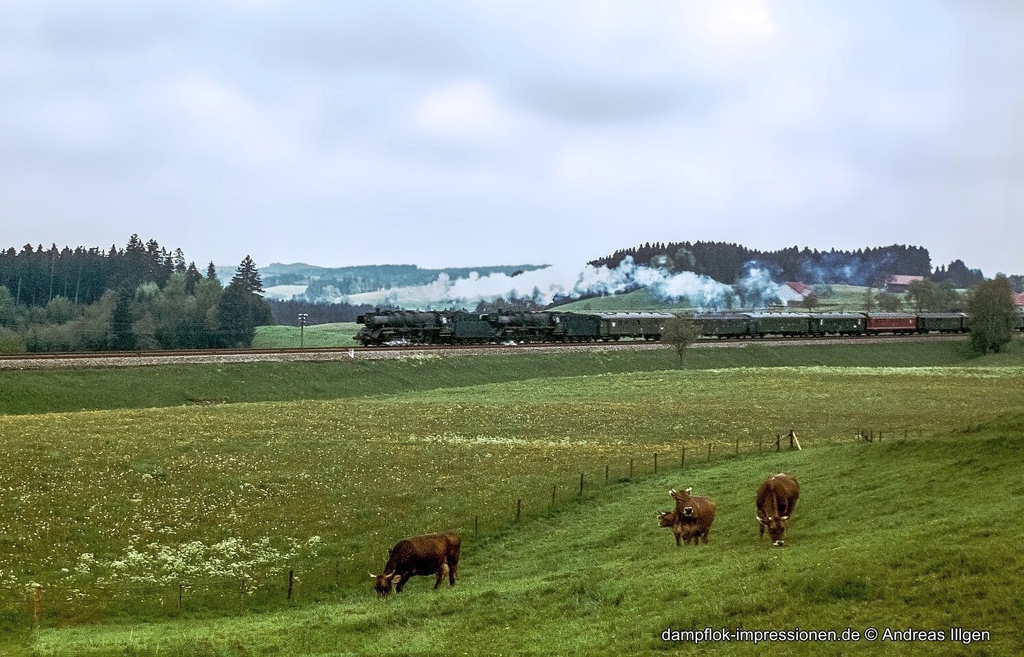 Da wir in den letzten Einsatzmonaten der Ulmer 03 nur schwarz-weiß unterwegs waren, ist es erfreulich, dass uns neben Andreas Illgen mit seinen Dias von den Abschiedsfahrten auch Gerhard Baum bei dieser Fotostrecke mit einigen Fabbildern unterstützt. Dessen spezielles "Revier" war damals der Bahnhof Laupheim-West. Und wenn er als Laupheimer die Kamera seines Vaters geliehen bekam, entstanden nicht zu wiederholende Aufnahmen von den letzten 03-Planzügen der DB. Auch die Abschiedsfahrt am 21. Mai 1972 haben er und sein Vater in Dias festgehalten, ebenso eine weitere Abschiedsfahrt der 03 088 am 9. Juli 1972, veranstaltet von den Ulmer Eisenbahnfreunden, von Ulm auf der Donaubahn bis Beuron und zurück. Zuvor gab es bereits am 12.3.1972 eine EUROPAVOR-Sonderfahrt von Ulm nach Weinfelden (Schweiz) und zurück. Das Wetter spielte an diesem Tag ebenso wenig mit wie zwei Monate später, am Pfingstsonntag. 03 131 zog den Zug am 12. März über die Donautalbahn bis Beuron und Tuttlingen. Von dort ging es an den Bodensee nach Radolfzell. Als Überraschung half ihr hier die Schwestermaschine 03 088, den Zug nach Konstanz zu bringen. Für den steilen Abschnitt bis Weinfelden spannte man eine dritte Maschine vor: die Tenderlok 5810 der Mittelthurgau-Bahn. Nächstes Ziel war Friedrichs- hafen. Von hier ging es im Salondampfer-Doppelpack auf der Südbahn wieder zurück nach Ulm. Eine (letzte) Abschiedsfahrt gab es dann mit der einzig noch einsatzfähigen 03 088 am 3. September 1972 von Ulm nach Memmingen und weiter nach Leutkirch und Bad Waldseee. Von Aulendorf ging es wieder zurück in die Donaustadt. Und die "allerletzte" Fahrt führte von Ulm nach Biberach, als die 03 088 bereits in Friedrichshafen Heizdienste leistete in der trügerischen Hoffnung, damit dem Hochofen zu entgehen.